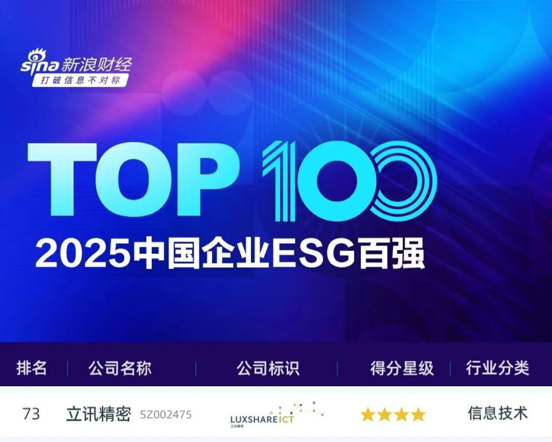 新年传捷报,首誉启新程。立讯精密凭借在ESG领域的卓越表现,成功入选新浪财经首次揭榜的“2025中国企业ESG百强”名单。这标志着公司的ESG实践获得主流财经媒体与市场的高度认可。